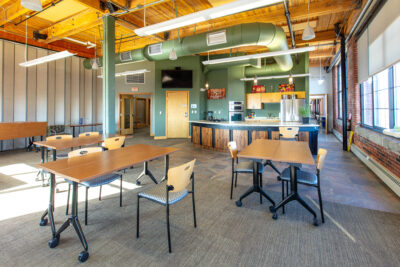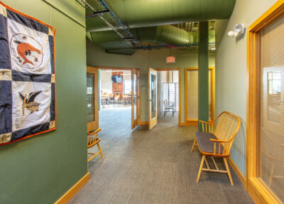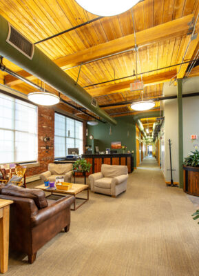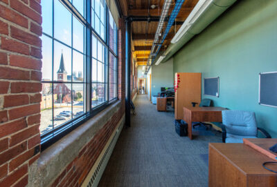 The available space is on the top floor of the building and offers views of the Androscoggin River and a well-balanced layout, including private offices, open work areas, and conference rooms—ideal for a variety of professional users.